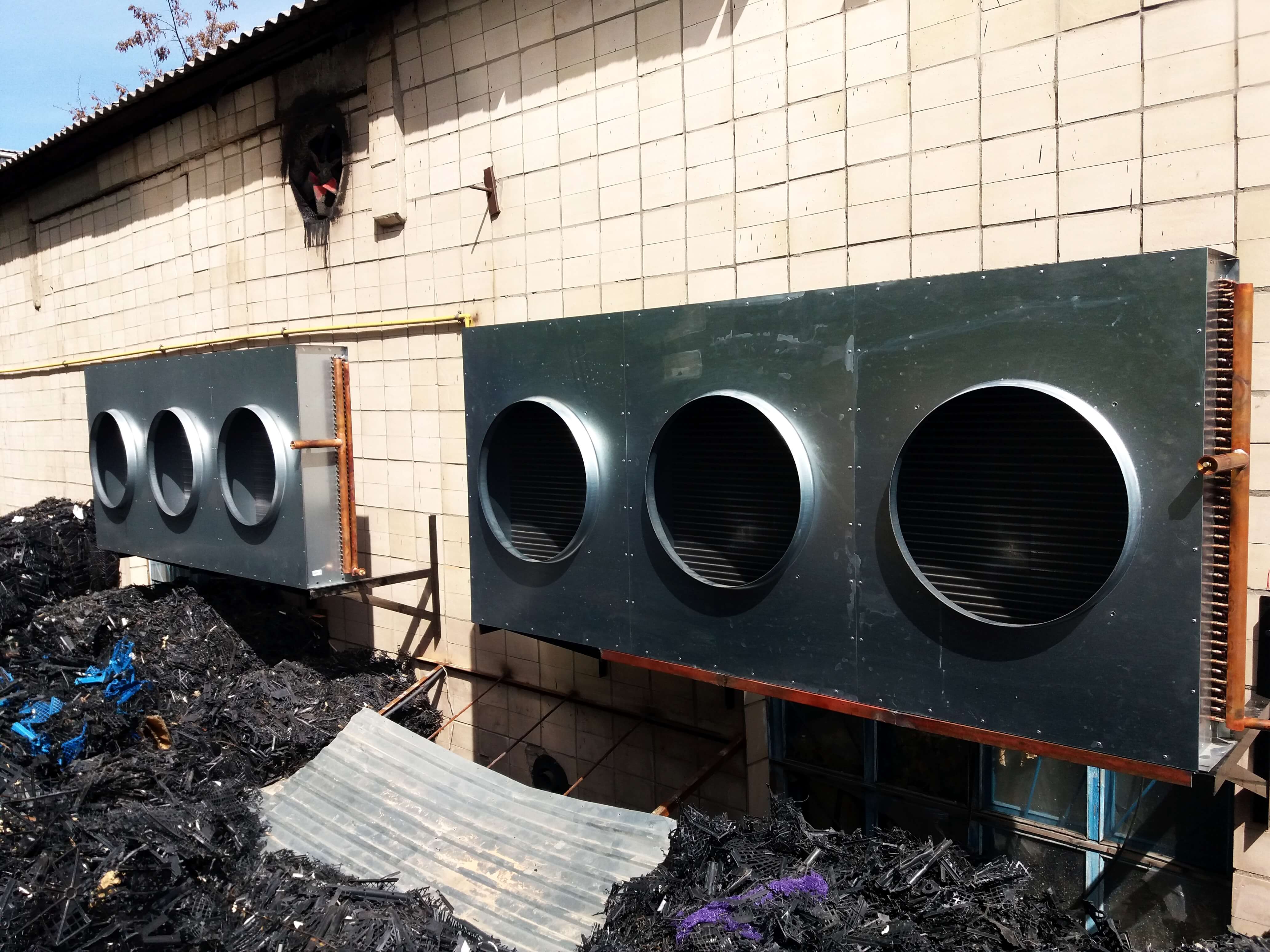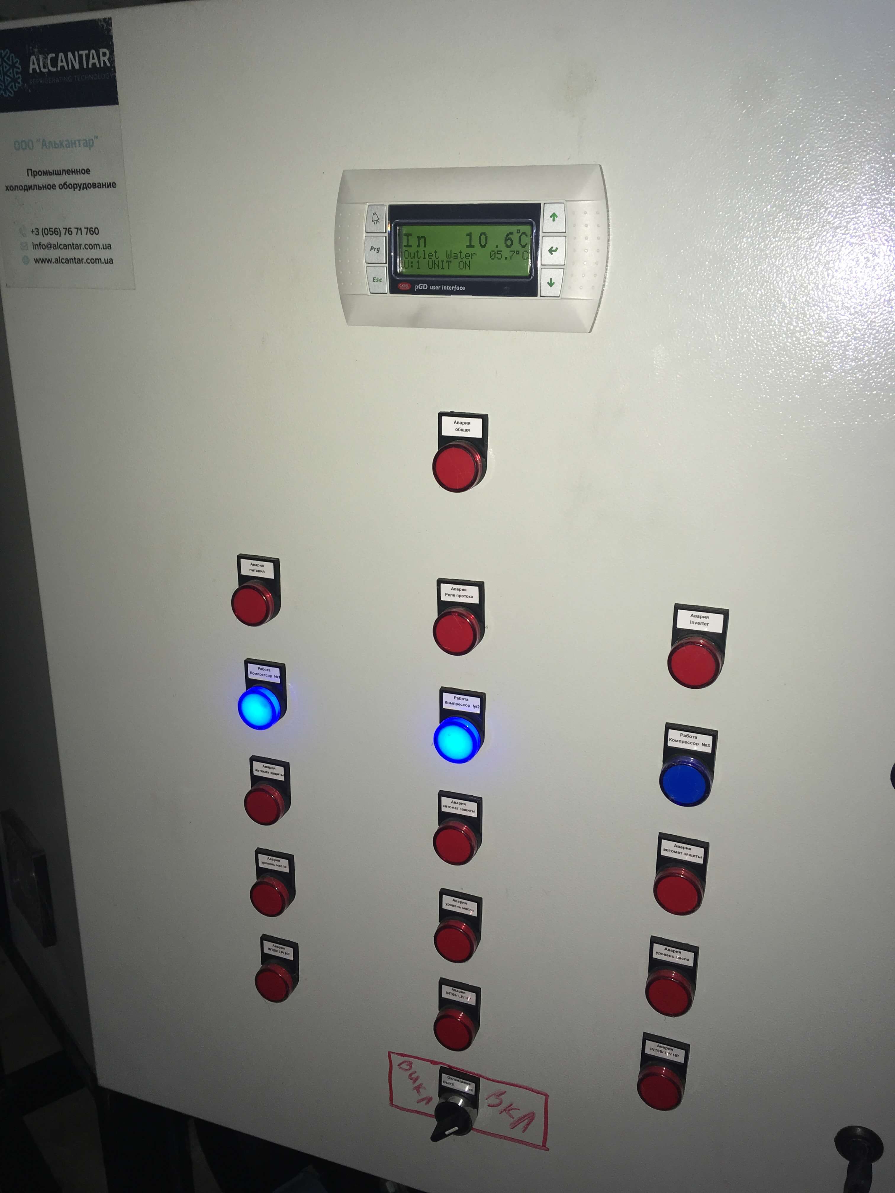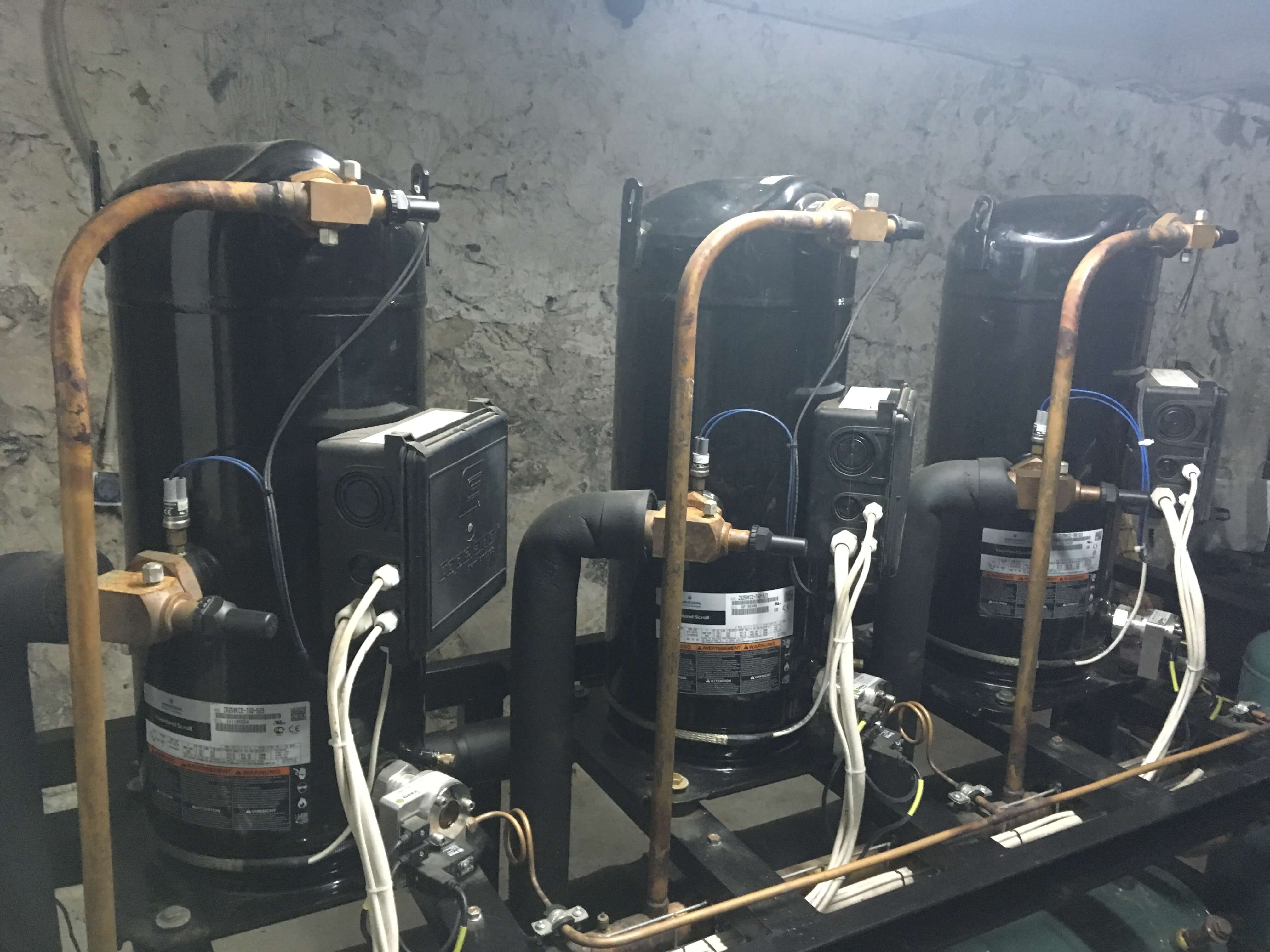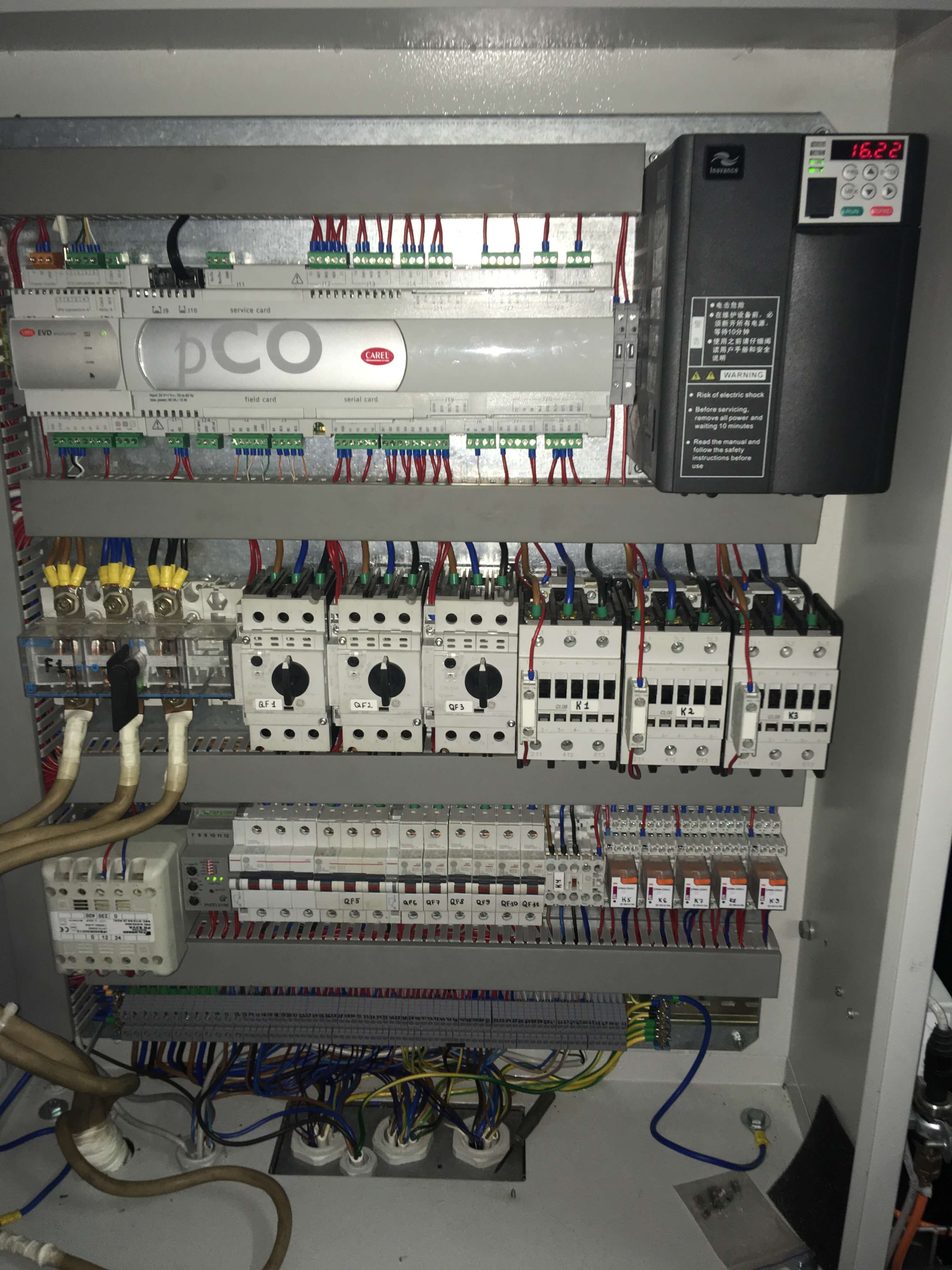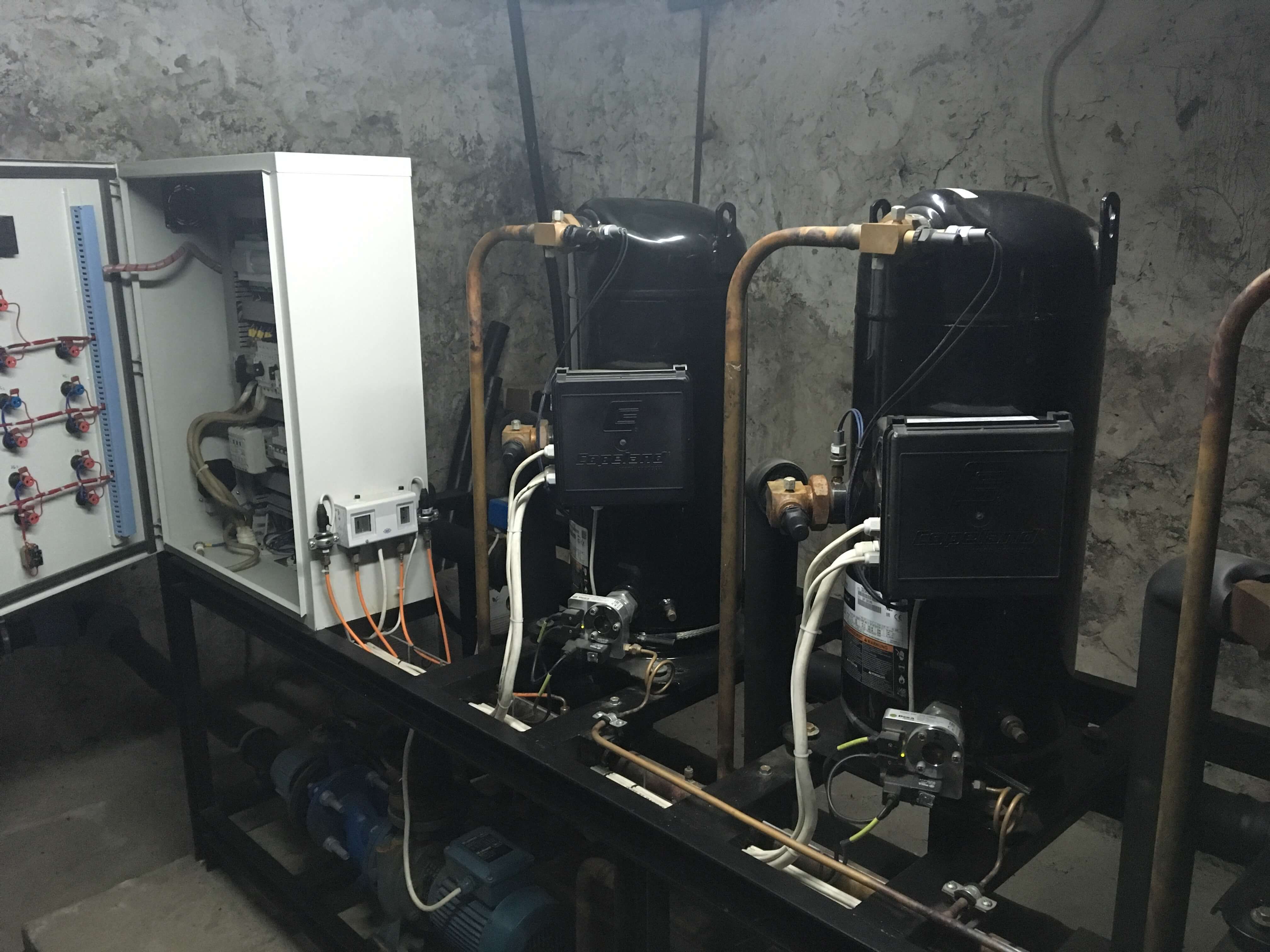Для реализации проекта были использованы герметичные спиральные компрессоры, которые наиболее соответствуют для выполнения данной задачи. В данной установке в качестве хладоносителя используется неподготовленная вода, поэтому был использован кожухотрубный теплообменник, конструкция которого делает возможным его обслуживание. Управление установки осуществляется контроллером Carel pCO совместно с частотным преобразователем, для управления вентиляторами конденсатора. Чиллер эксплуатируется в широком температурном диапазоне окр. среды от -25С до 40С. При необходимости холодильная машина может быть доукомплектована системой «Free Cooling» и рекуперацией тепла.